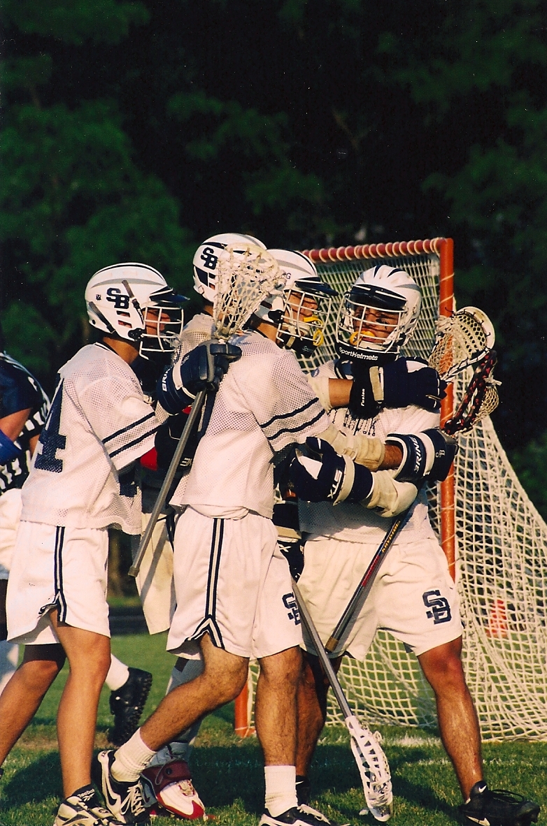 1998 | Jay Miaritis is mobbed by Mike Titus (left) and Sean Metz (right) after his game-winning goal in a 9-8 win over Shoreham-Wading River in the County semifinal
