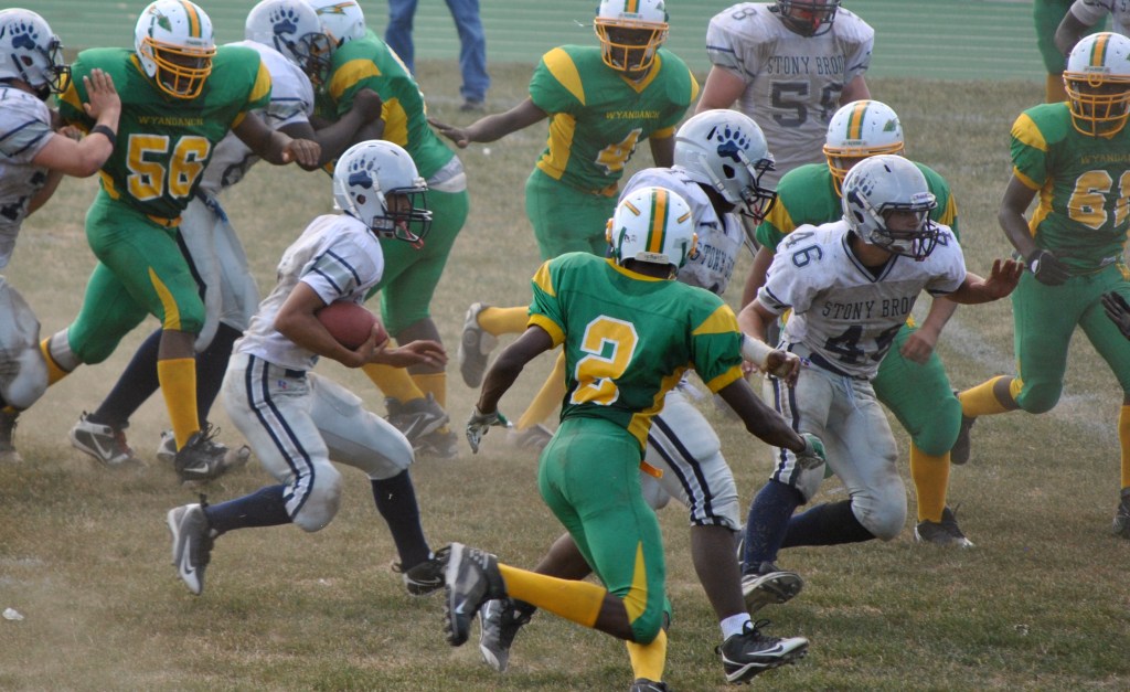 The most frustrating thing about this loss is that we were the better team. We were better coached, had a more diversified offense, and could have come out the victors had a handful of plays unfolded differently. We had more first downs and more completions, but we also had more turnovers (4-2). Untimely penalties also hurt us, but those things are to be expected with a young team. Our defense looked strong in spots, but for long stretches had trouble tackling and plugging up the enemy’s run. Wyandanch’s yards after contact is sure to be an ugly stat, but along with these negatives some positive things still shone.