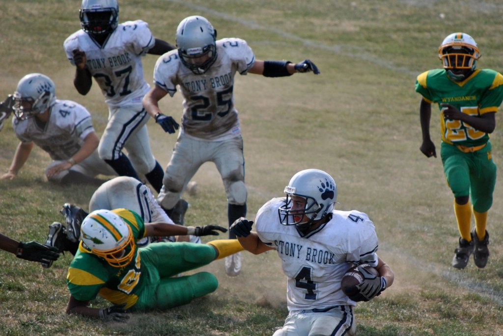 The Bears’ second offensive possession began with a nice run by captain Tank Ekokobe, but a Wyandanch interception on the next play impeded our chance to take back the lead. Jerome Washington made a great hustle play to strip the ball as a Warrior attempted to run the ball down the field after the interception, but a tough call allowed the hosts to retain the ball. The Stony Brook defense looked much sharper this time around as both Don Liotine and Andrew White delivered bone-jarring hits to stall their advance and force a punt.