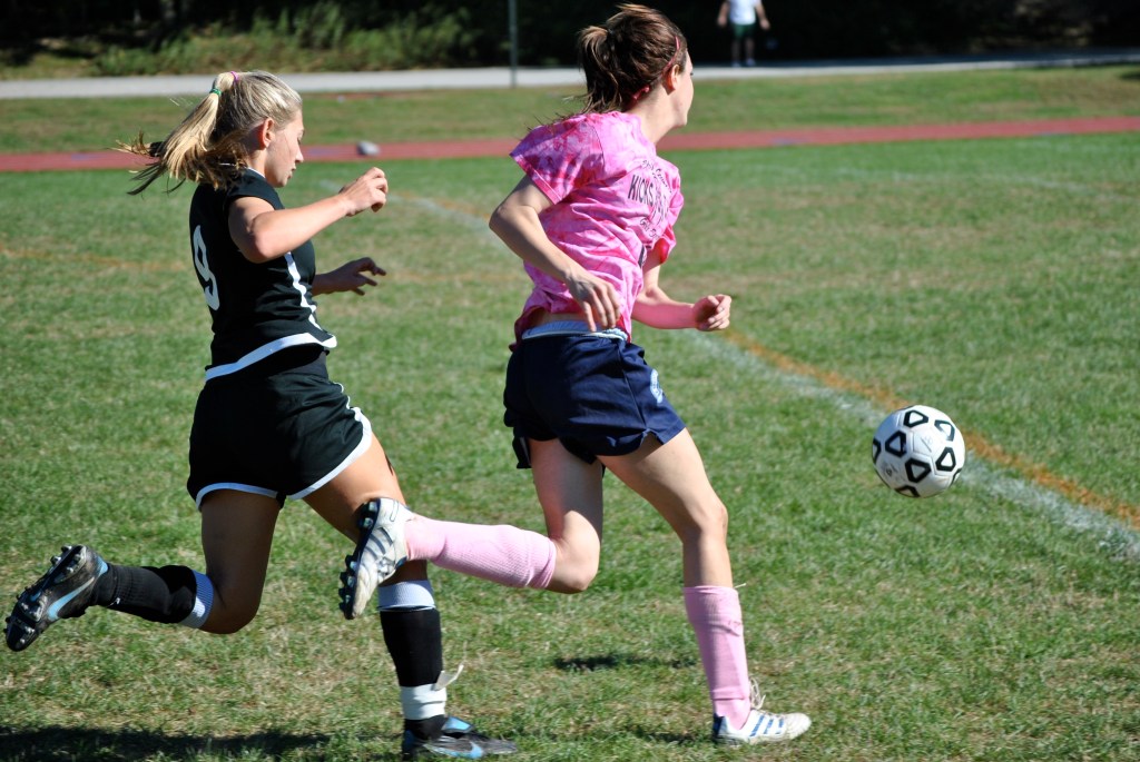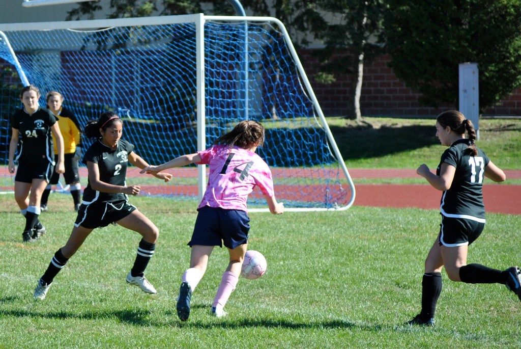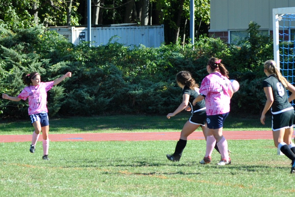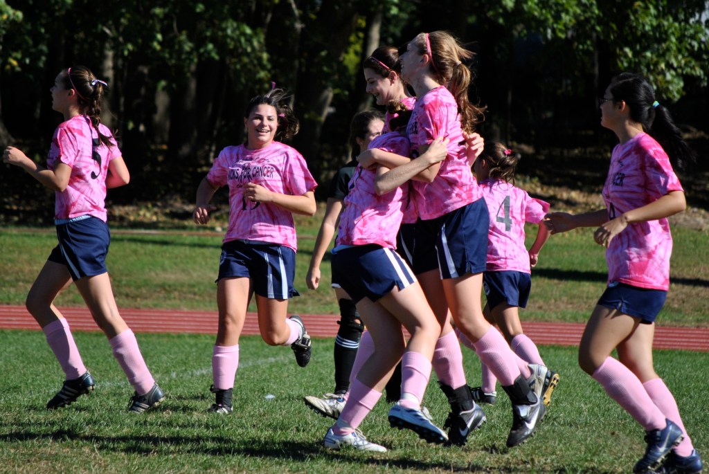 Indian Summer arrived just in time for Homecoming Weekend as the girls’ soccer team took on Pierson yesterday afternoon. They were not clad in their familiar white jerseys but in pink shirts that read, “Kicks for Cancer,” a Suffolk County breast cancer fundraiser to which our girls contributed. In front of a large crowd of alumni the girls played well and dismissed the Whalers 2-1.