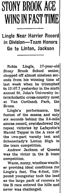 Robin Lingle continued his spectacular senior season by blazing the Van Cortlandt Park course in 13:07 to take 1st place in the prestigious St. John’s Invitational. Lingle’s performance was the fastest of the season on one of the world’s most famous courses and only six seconds off the 2.4-mile record.