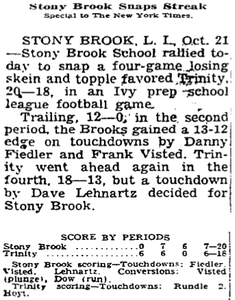 The boys responded with a resounding triumph, but it did not look optimistic from the outset as the Blue and White trailed 12-0 in the second quarter. Touchdowns by Danny Fiedler and Frank Visted vaulted Stony Brook into the lead, 13-12, but Trinity reclaimed the lead, 18-12, in the fourth quarter. With yet another crushing defeat looming, it was Dave Lehnartz who delivered the Blue and White with the game-winning score.