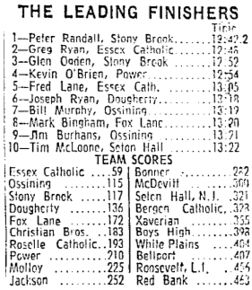 Stony Brook Hall of Famer Peter Randall continued his sensational senior cross country season by outclassing the field at the 18th Annual Fordham University Eastern Interscholastic Cross Country Championships. With the win, Randall became the second of three Brookers to win the prestigious title, joining Robin Lingle in 1959 and later Richard Shay in 1968 and 1969.