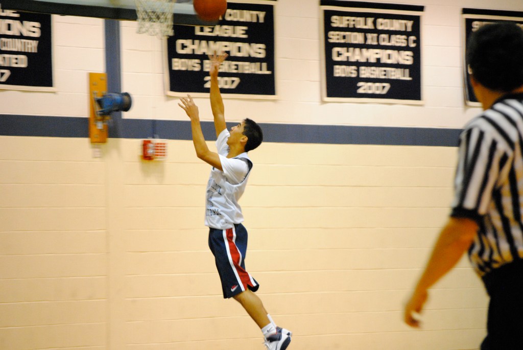 Right from the start the boys overmatched their opponents in every facet of the game. Both teams looked rusty in the early going as they tried to recover from their turkey dinners two days earlier, but the Bears took control with a quick 4-0 lead on two putbacks by Farqu Taylor and Jerome Washington. After a Stony Brook free throw and a Rocky Point 3-pointer, back-to-back scores by Washington put the blue and white up, 9-3. A flurry of activity followed, allowing the Brook to extend their lead. First, Marco Masakayan snared the Bears’ third steal of the quarter and raced down the floor for a layup (11-3), then Rocky Point hit another from behind the arc (11-6). Stony Brook followed with a turnover, Taylor took a charge, and Washington dropped in his fourth score of the quarter (13-6). | 13-6