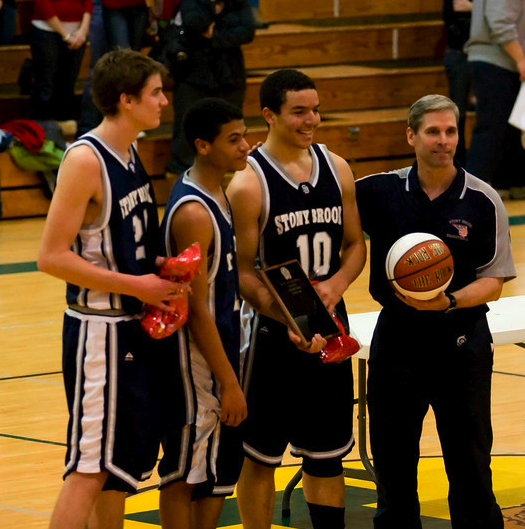 In the locker room before the game coach Hickey addressed his battered troops and asked each of them what their favorite memory of the season was. Senior Eric Duff responded with the answer his coach was looking for: “This game is going to be my favorite memory,” he boldly said. The Brook responded by running their rivals off the floor. Pizzichillo turned in one of the most courageous performances in Stony Brook history, scoring 31 despite his sickness, on his birthday no less, in leading the Bears to a monumental win. Freshman Tim Pandolfi added 12 big points and Duff chipped in with 11.