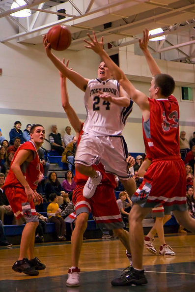The Bears fiercely battled the Class AA Bulls for three periods, but found themselves down by eight entering the fourth quarter. Still trailing by three with 2:29 left, the Brook went on a 7-0 run, the first five of which were scored by Lou Pizzichillo who vaulted to Bears into the lead on a clutch 3-point play with 1:33 showing on the clock. Mitch Singer scored a team-high 19 points while Pizzichillo added 11.