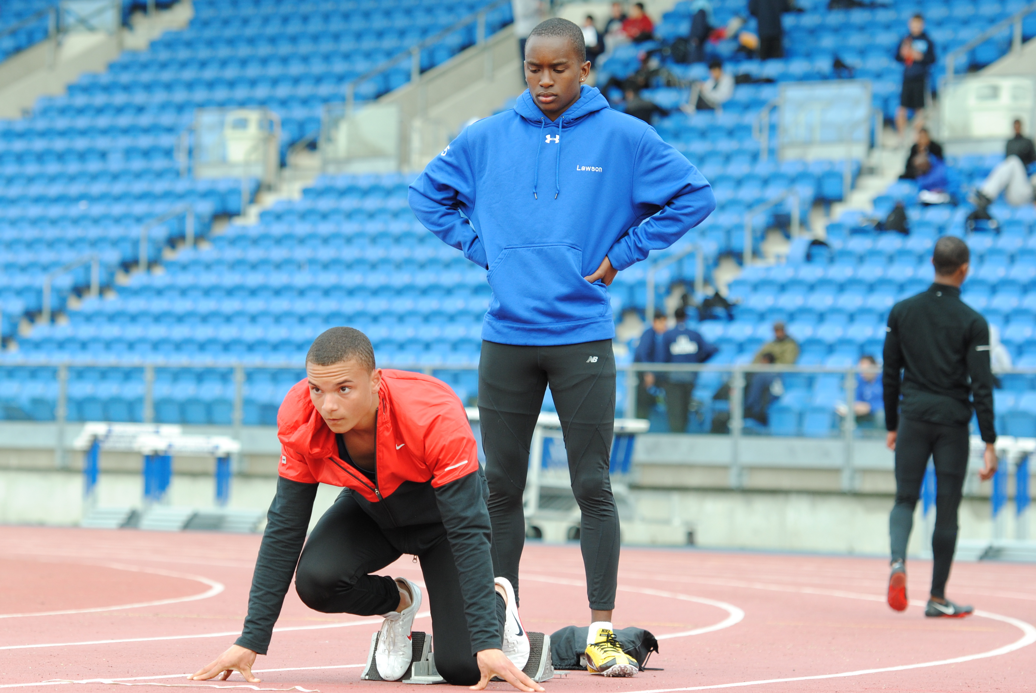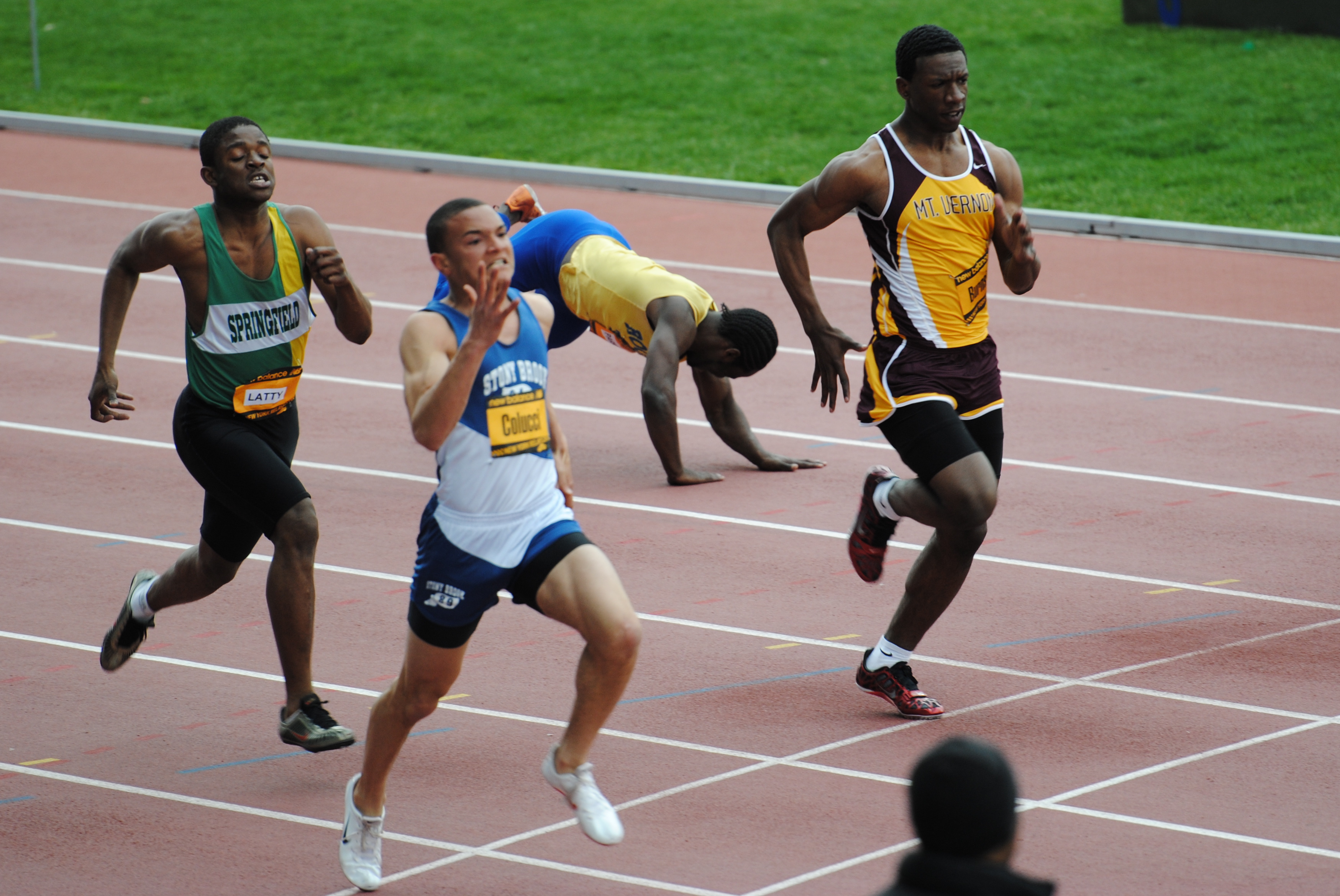 Next up for the Bears were the invitational 100 meter preliminaries. Khoren Lawson ran out of lane five in the first of four heats and won his flight in a quick 11.35 that earned him a place in Saturday’s final. Taylor Colucci was placed in lane seven for his heat, but overcame the difficult spot to win in 11.41 to leave him just one place shy of the final.