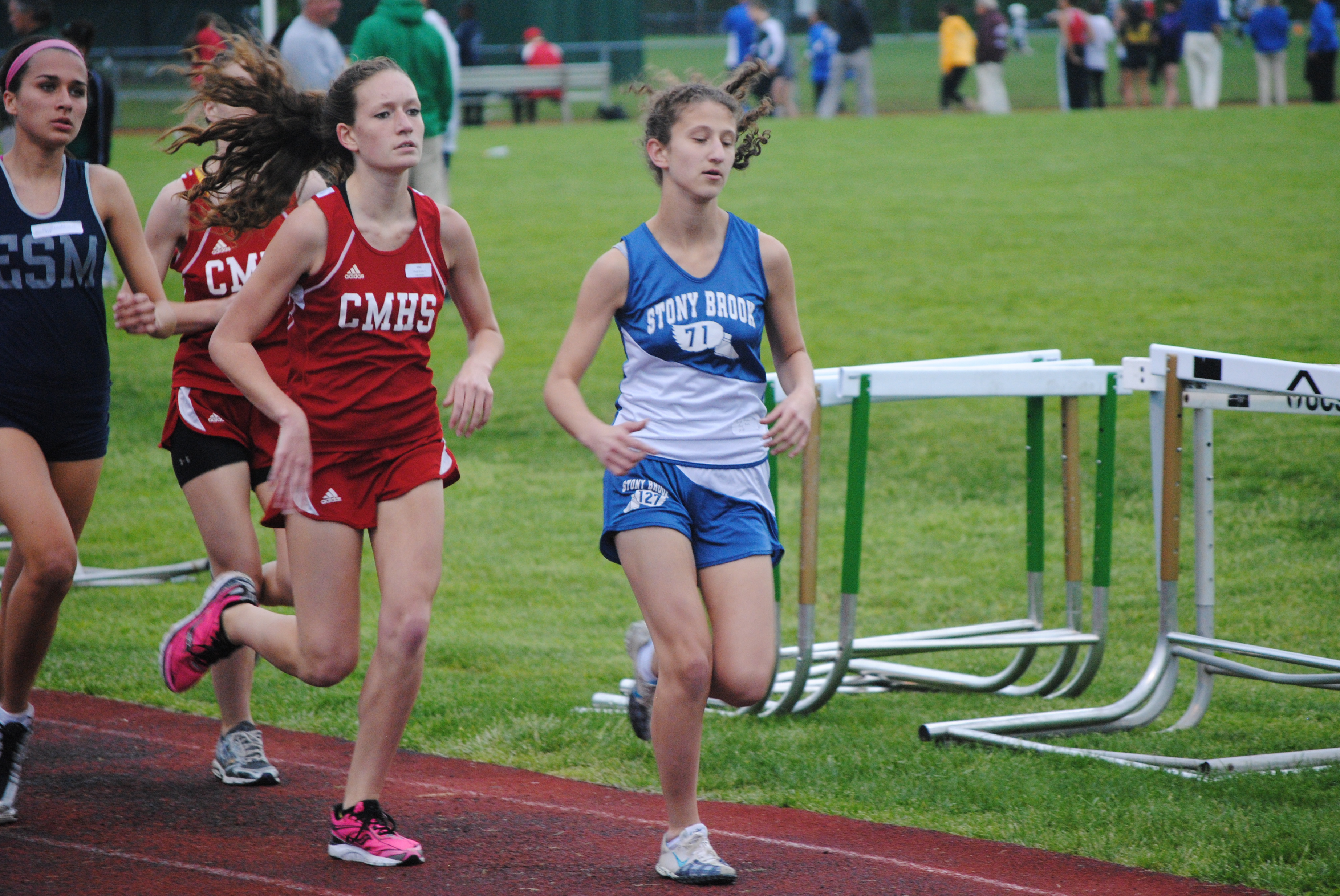 The rain held off yesterday for the girls’ meet, though thick cloud cover still hung like a pall. Only three girls competed for the Bears but among those “happy few” four personal records and two school records were eclipsed. Rebecca Hollis began her day well, setting the fastest FAT (Fully Automatic Timing) 400 meter hurdle time in school history, giving her a 3rd place finish among the freshman in 70.02. Even more impressive, she is a seventh-grader and has not yet turned 13. Through the FAT conversion rate (adding .24 to a hand time) Hollis has also run the fastest overall 400 meter hurdle time in school history, besting Robynne Dodd’s 29-year-old mark of 70.0.