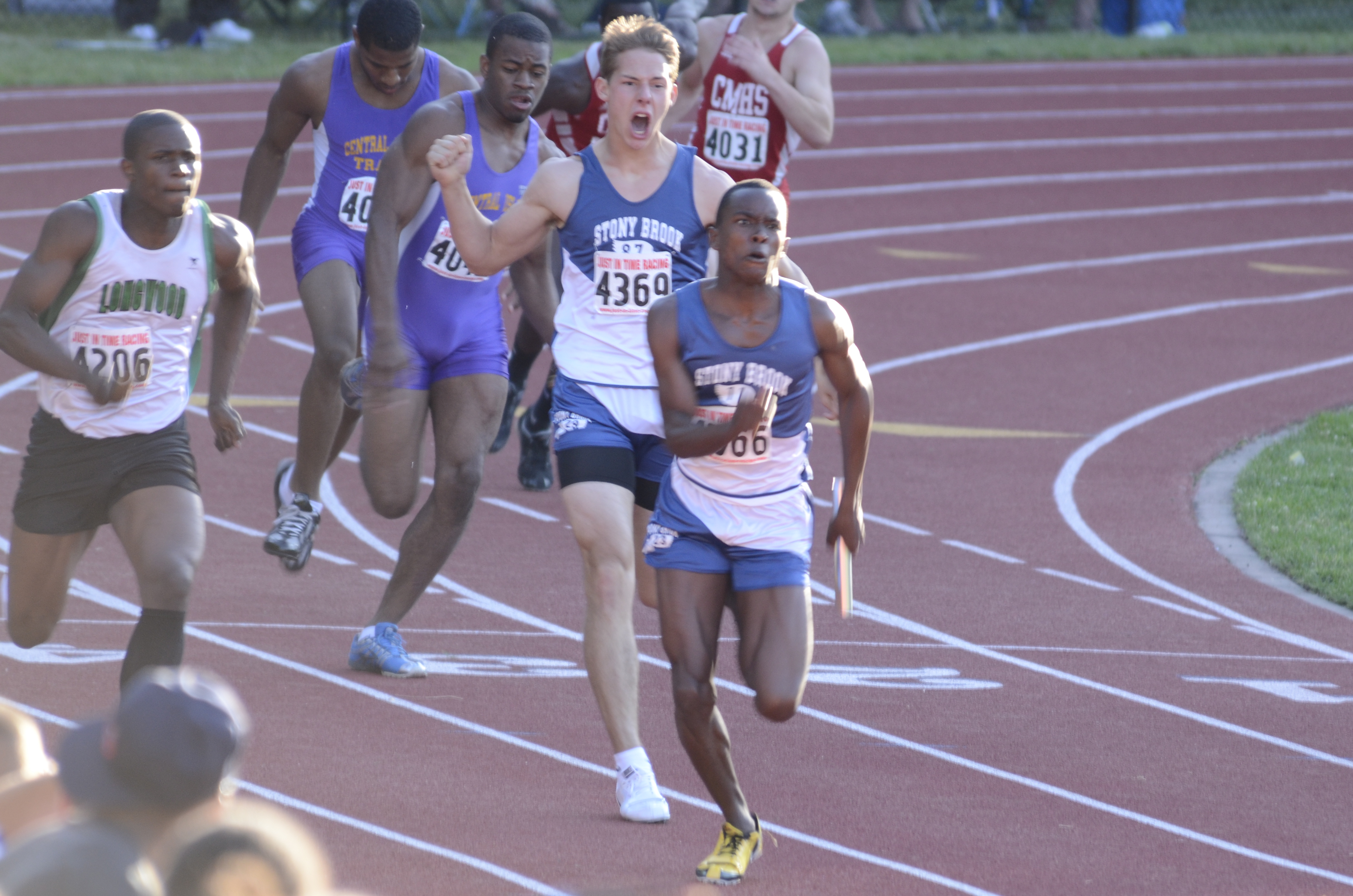 They were already the fastest quad in school history, but as our speedy foursome stepped onto the track at Port Jefferson they wanted to cement their legacy as one of the fastest teams in the state. White ran the opening leg and, despite standing up out of the blocks a bit too quickly, ran strongly in his first time running leadoff. Colucci tore up the backstretch after receiving the baton and was in the lead when he gave it Wentling who ran step-for-step with Longwood’s third man, prompting the announcer of the meet to exclaim, “Here comes Stony Brook!”