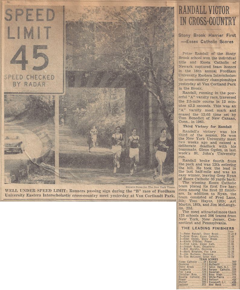 Randall, running in the powerful “A” varsity race, traversed the 2.5-mile course in 12 minutes 42.2 seconds. This was an “A” varsity meet mark and erased the 13:03 time set by Tom Benedict of New Canaan, Conn., in 1961.