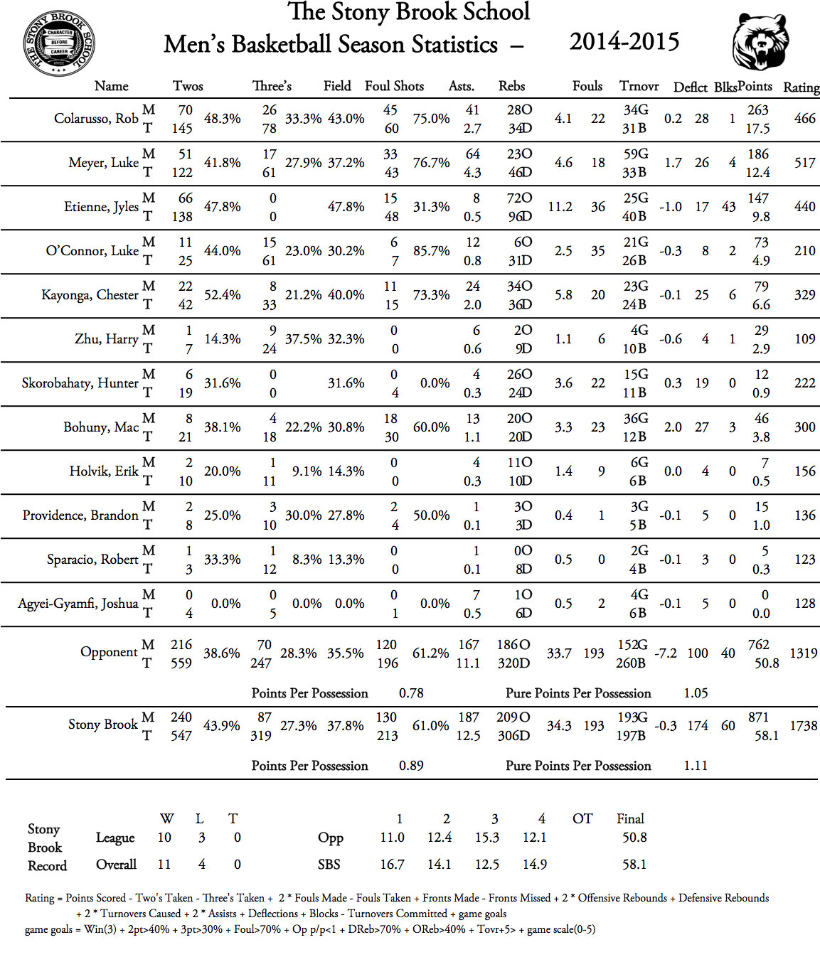 For the better part of the last 25 years, Thom Brownworth has been the statistician for the boys’ basketball program. For years his position on the bench, perched over a tape recorder, has been a mainstay of Stony Brook Basketball and His detailed analysis of individual and team performance a vital part of the program’s success. The crown jewel of the operation is his homemade rating system which he derives from the formula you’ll find at the bottom of the score sheet.