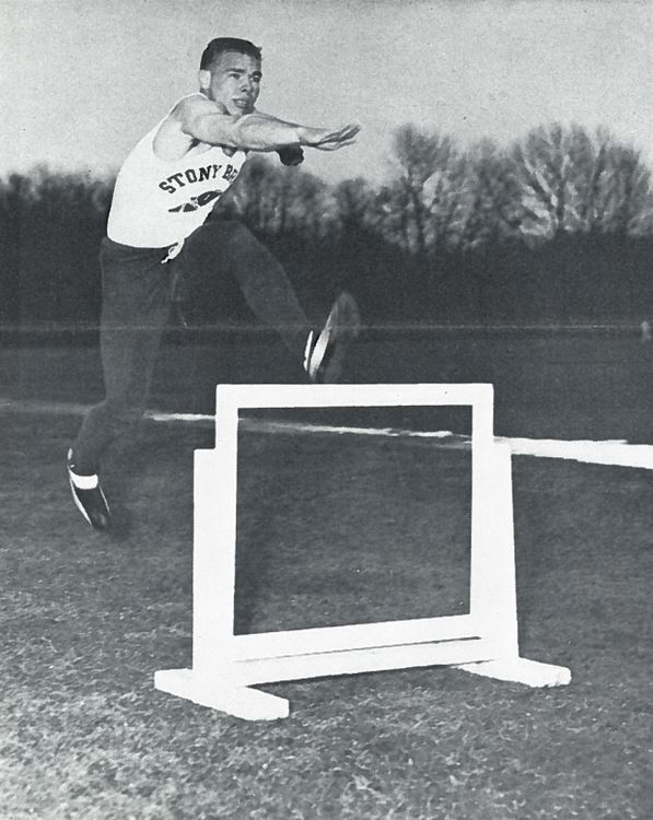 The 1956 Stony Brook track team will be considered outstanding in the school’s athletic history. Although cold and snowy weather delayed the season’s opening, the trackmen were victory-bound from the start. Six of the leading scorers were Stuart Dow with 88.5 points, Robert Knecht with 51 , Gordon MacDonald with 34.5, James Gross 22.5, Richard Wolf with 19, and James Boice with 18.5.~ July 1956 Stony Brook Bulletin