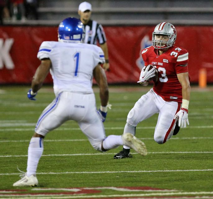 On a rainy evening at LaValle Stadium, Don Liotine ’13 and the Stony Brook University football team cruised past Central Connecticut State, 38-9.