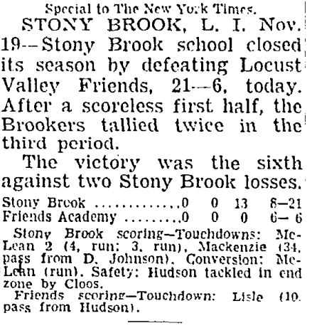 After a scoreless first half, the Blue and White offense finally warmed up as they reeled off two touchdowns in the third quarter, courtesy of four and three-yard scoring runs by Read McLean. In the fourth quarter, Robert MacKenzie helped put the game away when he took a Dave Johnson pass 34 yards for the score. A safety by All-Ivy League lineman Dave Cloos completed the scoring. The win gave the Brook a 6-2 season record, their best since Floyd Johnson’s boys went 5-1-1 in 1949.