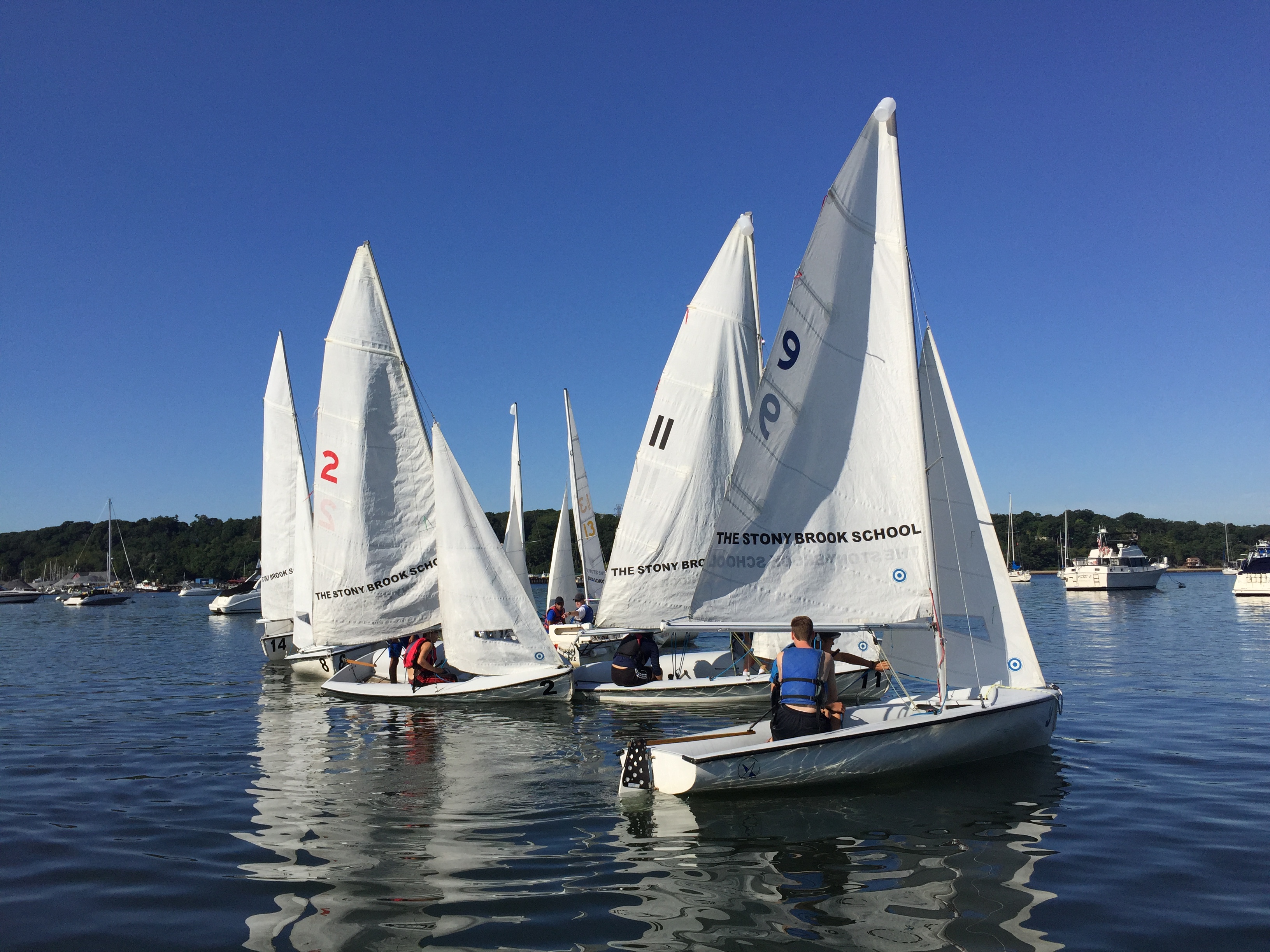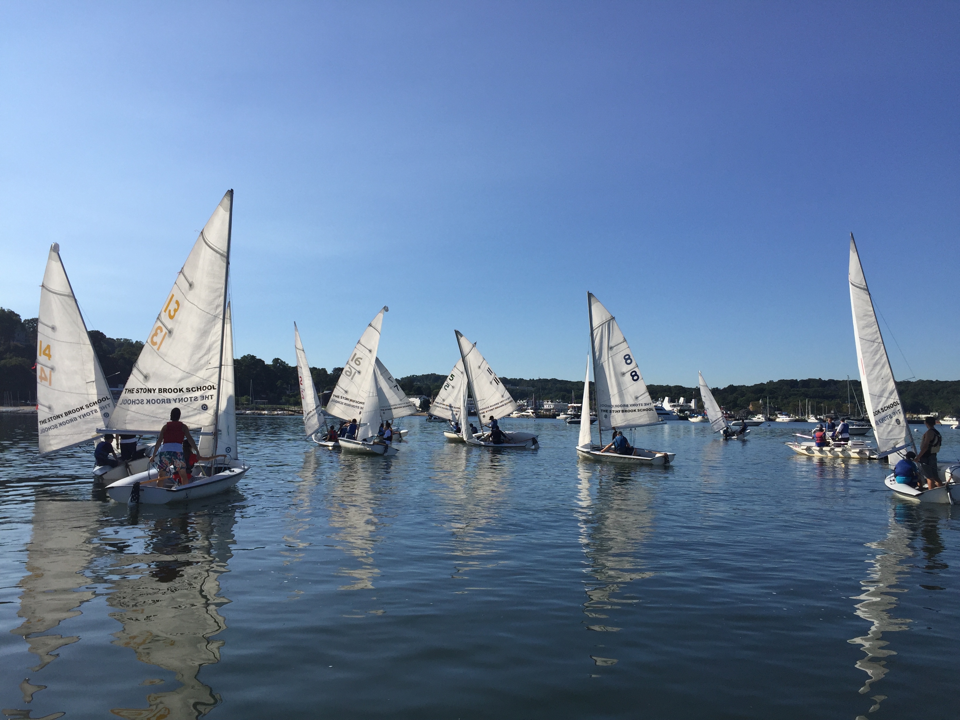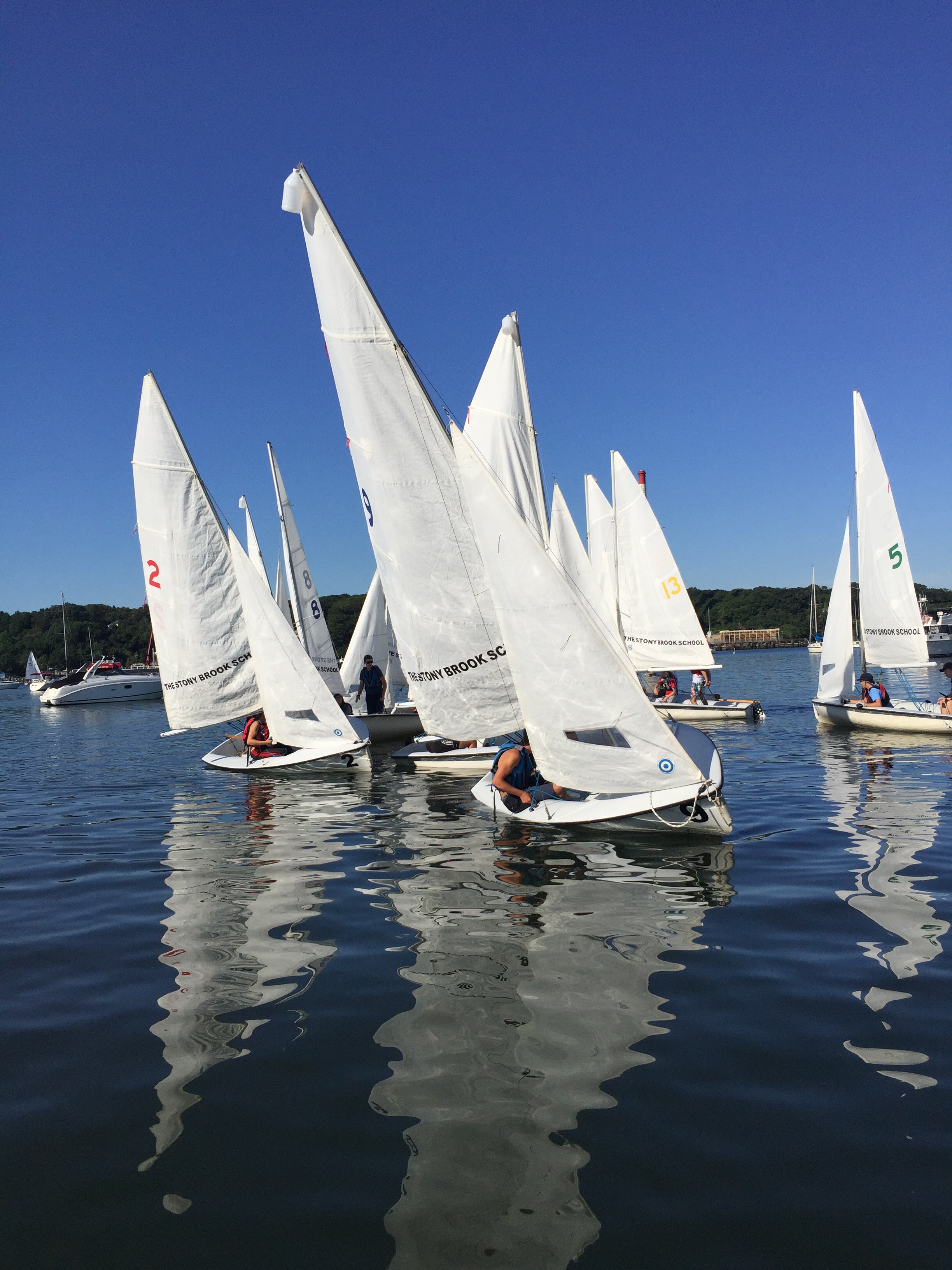 Yesterday morning, the fleet was once again in action as the sailing team plied the glassy waters of Port Jefferson Harbor. The highlight of the day, according to coach Leslie Paige, was a series of beautifully executed buoy roundings. Here are some shots of the action from Coach Paige.