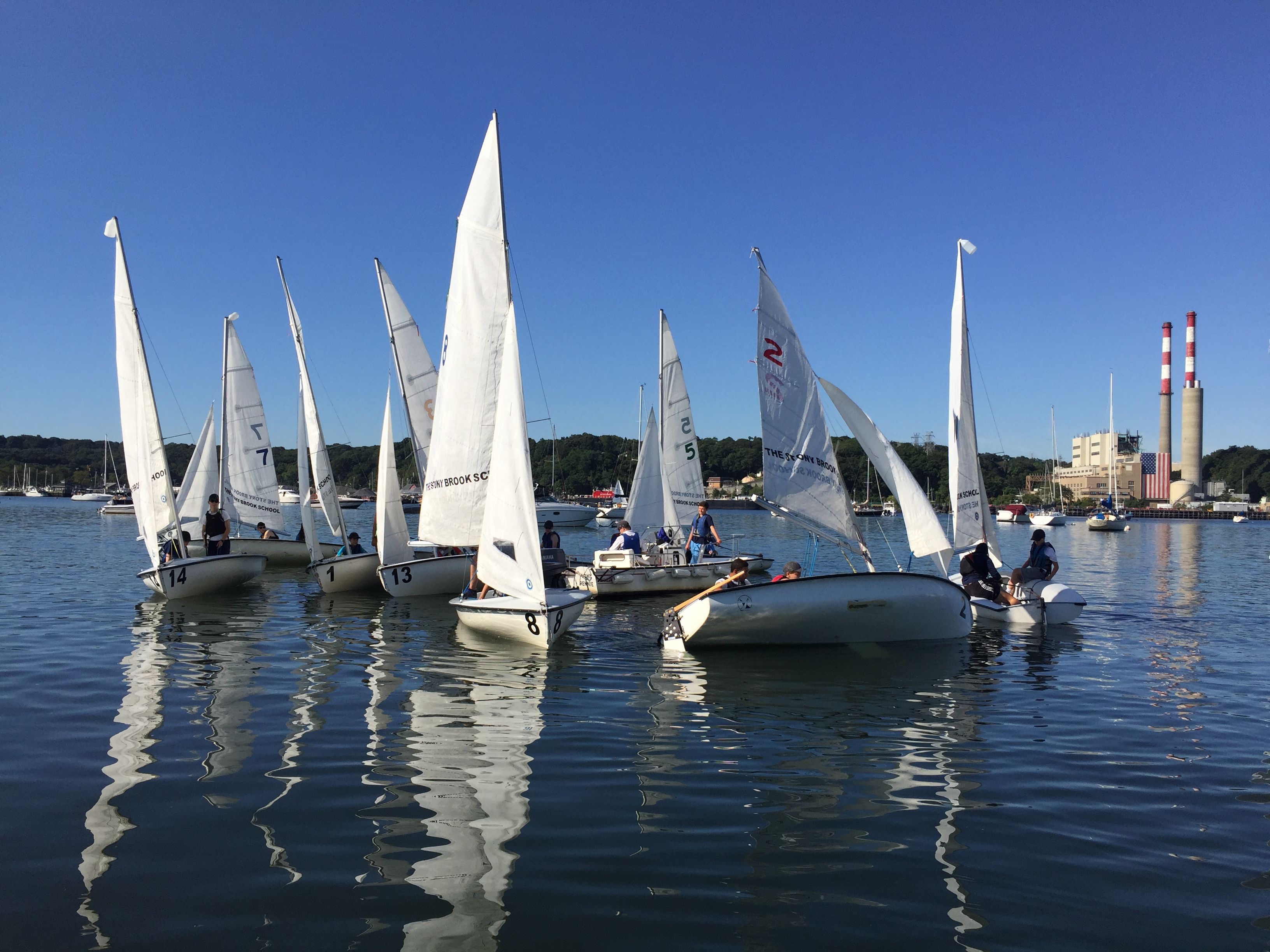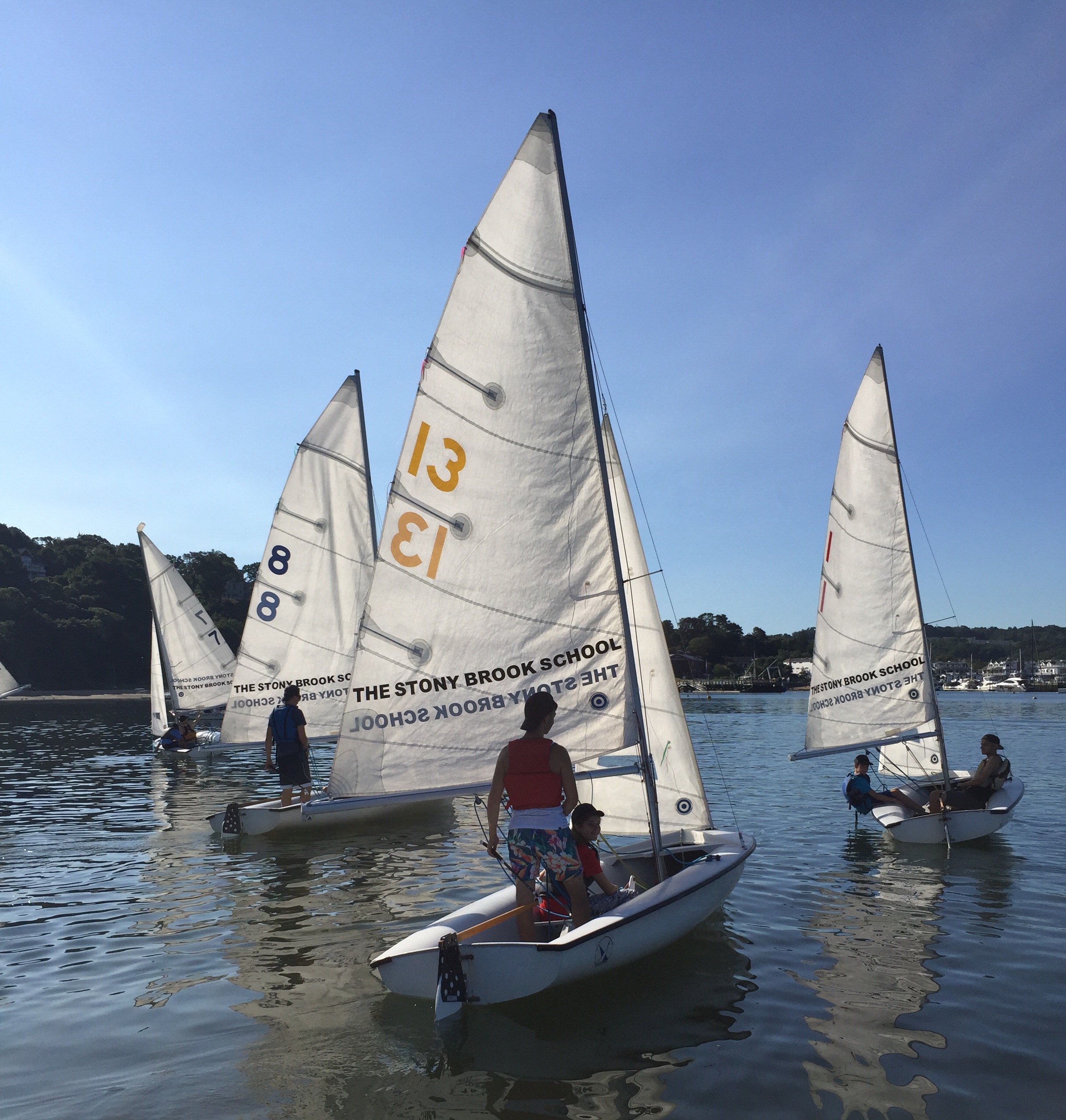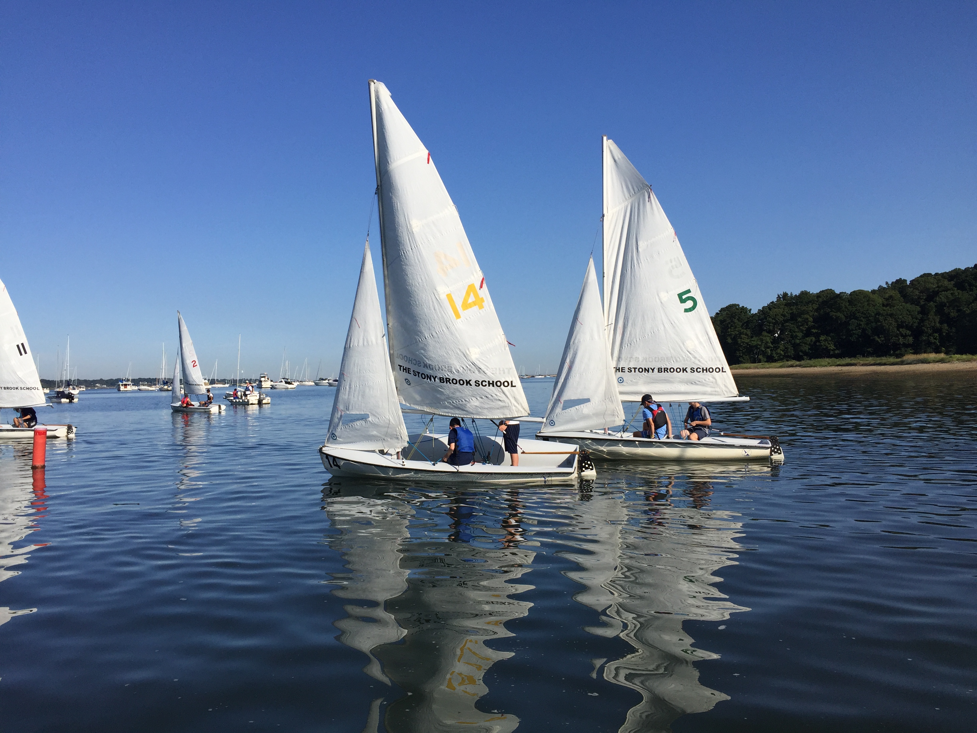 Yesterday morning, the fleet was once again in action as the sailing team plied the glassy waters of Port Jefferson Harbor. The highlight of the day, according to coach Leslie Paige, was a series of beautifully executed buoy roundings. Here are some shots of the action from Coach Paige.