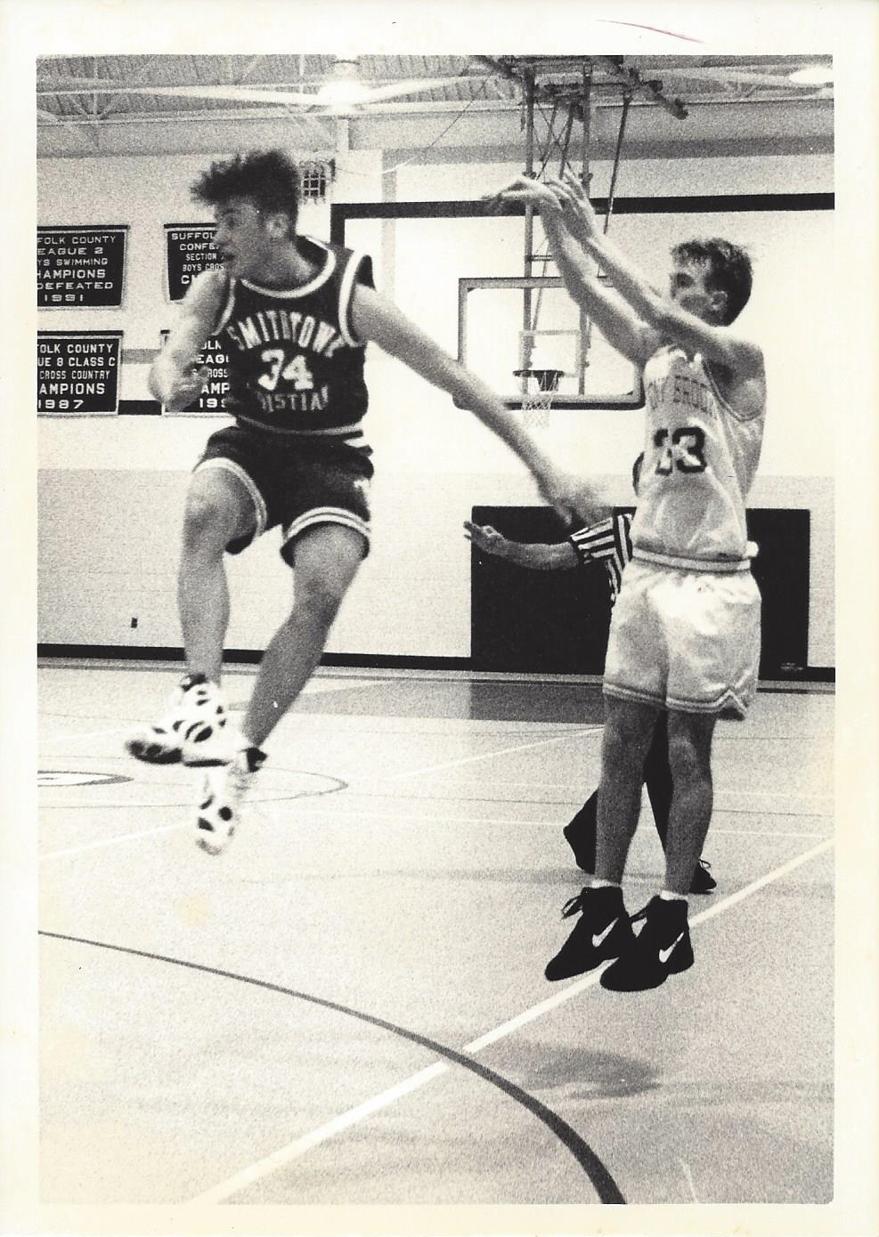 He remembers Stony Brook as a great place to play sports with quality teammates like Paul Ciofrone, Jeremy and Chris Meserole, and Matt Spooner. I remember Robbie as an absolute jet on the court, a fearless player in the game’s biggest moments, and a fierce, fierce competitor. One game in particular stands out to me. In a playoff game in 1996, Robbie scored the first 17 points of the game. At one point it was Robbie 17, Wyandanch 11. In the third quarter he hit a shot I’ll never forget. After walking the ball across half court he pulled up from inside the jump circle, splashing a 35-foot three-pointer. In the third quarter. Of a tight playoff game. He went on to score 39 points in a thrilling upset victory. No one was bigger in the biggest moments. Please join me in honoring, Robbie Marvin.