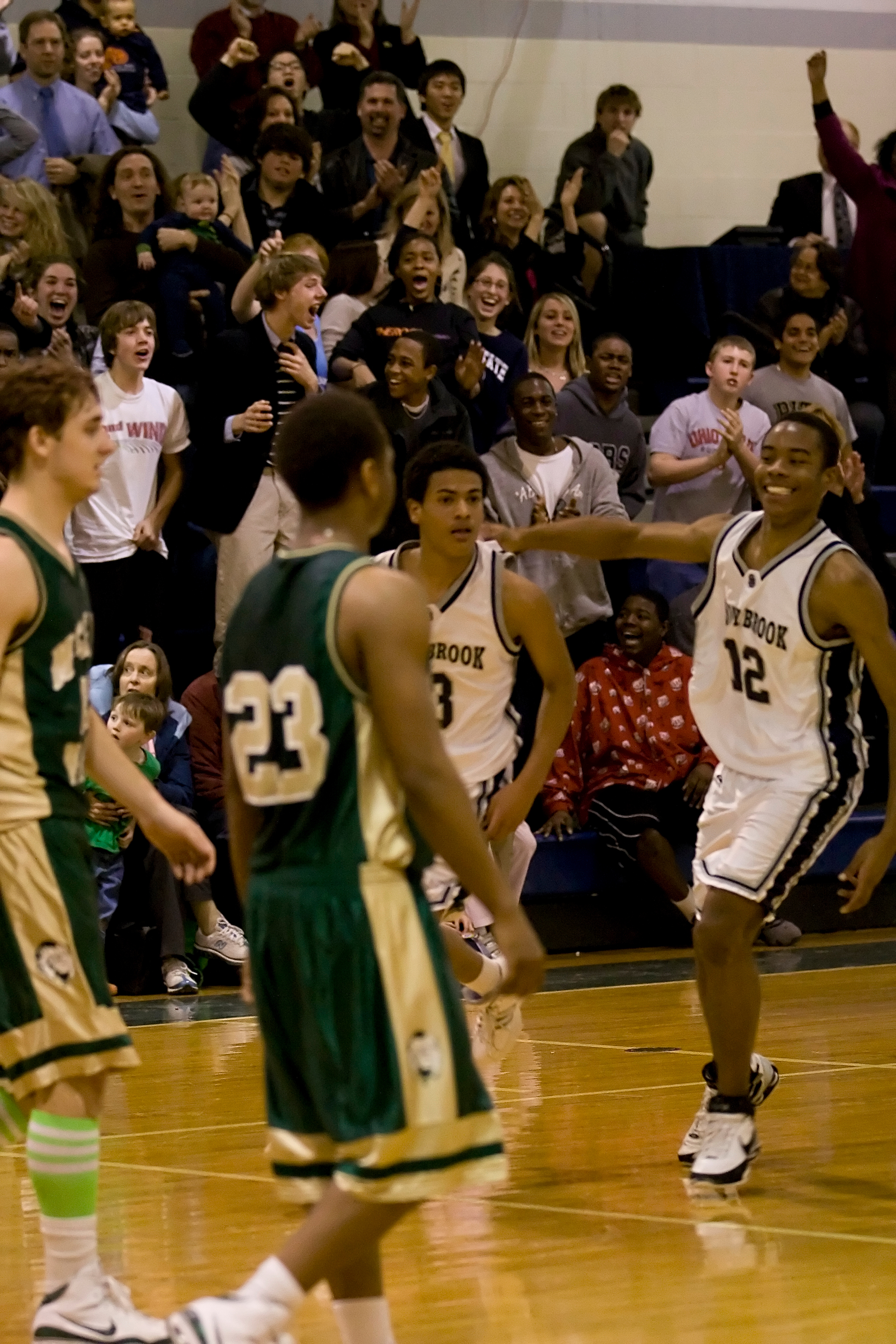 In their two regular season match-ups with the Monarchs, the Brook pulled out narrow victories. In the third match-up, the Bears found themselves down 24-25 at the half and still trailed by one after a taut third quarter that included a Mercy flagrant foul. In the final frame, with a championship berth on the line, the Bears outscored Mercy, 20-13, thanks to three of Tim Pandolfi’s four 3-pointers. His first broke a 41-41 tie. Then, he drained another to extend a Bear lead to 52-48. On the ensuing possession he sank a dagger into Mercy hearts with a sensational double-clutch 3-pointer, directly out of a spin move, that put the Brook up 55-48 and brought the Swanson crowd roaring to its feet.