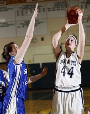 Andraya Spiliotis and Brannon Burke had 14 points apiece, as Stony Brook displayed its balance and depth. Coach Keith Singer says at any moment the Bears might have four legitimate three-point threats on the floor. Having Danielle Spiliotis who is 6-1 and one of the best three-point shooters in the county certainly helps.