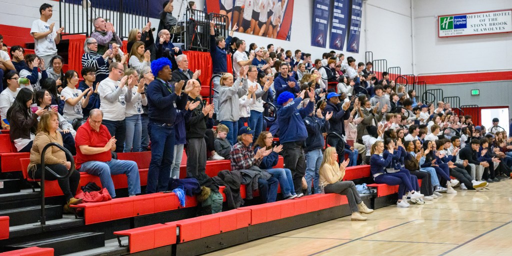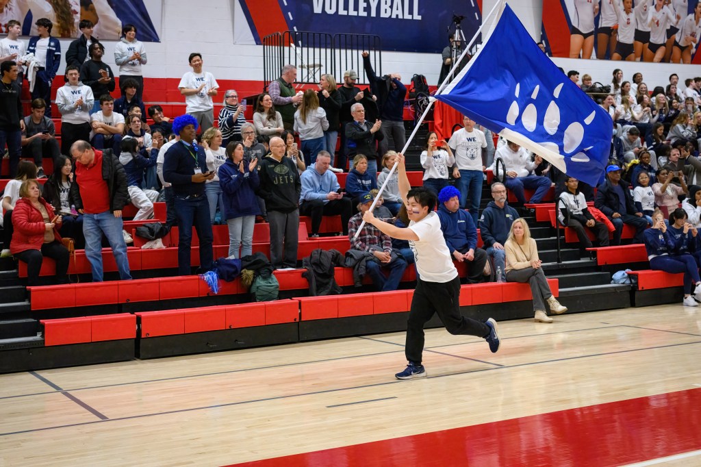 This year Stony Brook University’s Pritchard Gymnasium was chosen for the site of both the girls’ and boys’ PSAA finals. With the Bears playing in both games right across the railroad tracks, the school day ended early, and hundreds of students and faculty walked from campus to the university for a memorable community event. With five minutes to go before the game, the stands were only lightly populated until the Blue & White cavalry streamed into the arena and filled one entire side of the stands. The show of force was so impressive that several Portledge girls stopped their warm-up and actually covered their mouths in disbelief. The stage was set for the championship battle.